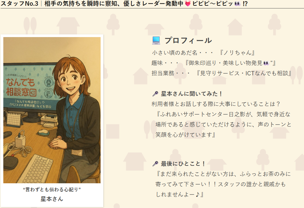 現在(2025.6.12)、4名のスタッフが在籍しております。顔写真は、流行りのAIを使用して作成してみました💻✨実物と似ているかどうか、ぜひふれあいサポートセンターHINOKAGEに足をお運びいただき確認してみて下さい😝
